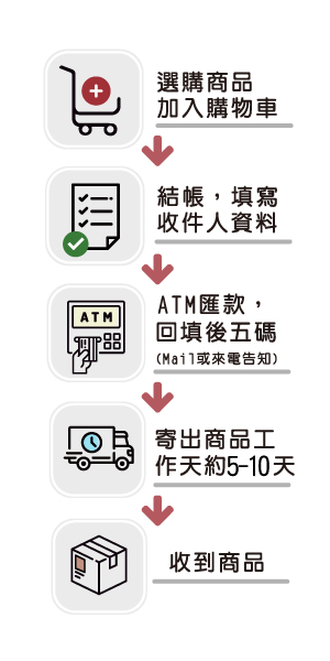 登入會員 > 選購商品 > 加入購物車結帳 > 確定數量與金額無誤 > 填寫付款方式 > 送出訂單 > 訂購完成